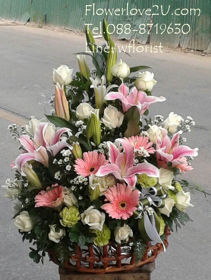 กระเช้าดอกไม้ โทนสีชมพูหวาน เน้นลิลลี่สีชมพู กระเช้าขนาดใหญ่พิเศษ