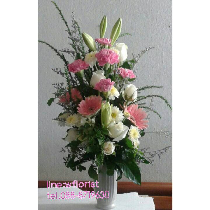 แจกันดอกไม้ กุหลาบขาว แซมด้วยลิลลี่สีขาว สะอาดตา
